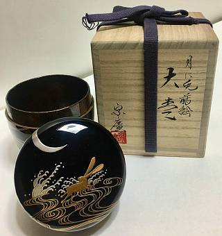 A Tea Caddy is one of basic tool for a tea ceremony.Tea caddy is neccessary for tea ceremony. There are 2 types of tea caddy. One is Natsume and another is Chaire. The Natsume is for thin tea powder and the Chaire is for thick tea. The Natsume is made of plastic, artificial wood or natural wood sometimes with lacquered pictures. The Chaire is made of potter with small bag ( Ko-Bukusa ). Some items are so beautiful and fashionable. It is presumed that they were used not only as a tea tool but their fashion item to show to their guets. We do not have enough items here due to time to prepare right now but we are planning expand our sales items. Please wait for a while with an expectation.-
