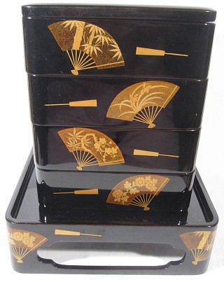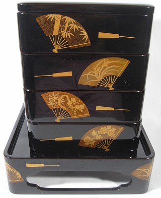 Item description : Wajima-nuri Jubako box with elegant Makie works of Japanese fans with 2 lids with 2 different designs