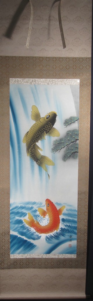Item description : Kenpon Kakejiku with leaping carps in the falls.
