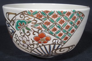 Item description : Kyorakuyaki tea bowl with design of the Chokudai (a theme provided by the Showa emperor) "Bridge" with a Japanese fan which is made in 1982 according to the past records of the Chokudai.