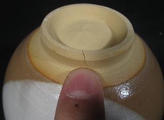 There is a tiny Kama-kizu (a flaw naturally made in the firing process in the kiln) seen on the Kodai (in the bottom)