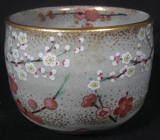 Item description : Kyoyaki tea bowl with Ume for March designed by Ms. Mutsuko Kuwano who is a famous and modern female artist in Japan. Its motif comes from the flowers growing in the Kyoto Imperial Palace.