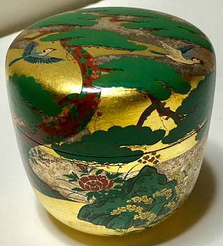 Item description : Oh Natsume tea caddy with gorgeous Makie works of Shunjyu Kacho-zu (seasonal flowers and birds) with Ikkan-bari finish (lacquered papier- mache)