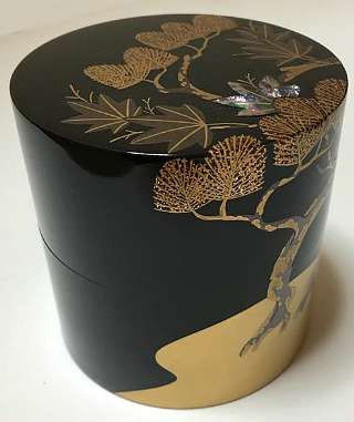 Item description : Natsume Tea caddy in Nakatsugi style with stylish Makie works of Matsu (pine) partially made of mother of pearl