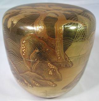 Item description : Oh Natsume tea caddy with fabulous Makie works of Sansui with Kao drawn by Kounsai who is the 15th successor of Ura-senke