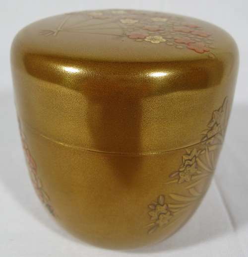 Item description : Oh Natsume tea caddy with elegant Makie works of seasonal flowers on gold leaf