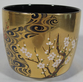 Item description : Kyoyaki tea bowl in Tsutsu Chawan style for winter with a wonderful design titled "Korinbai" orignally made by Korin Ogata who was a great artist in Edo period. (1600's)