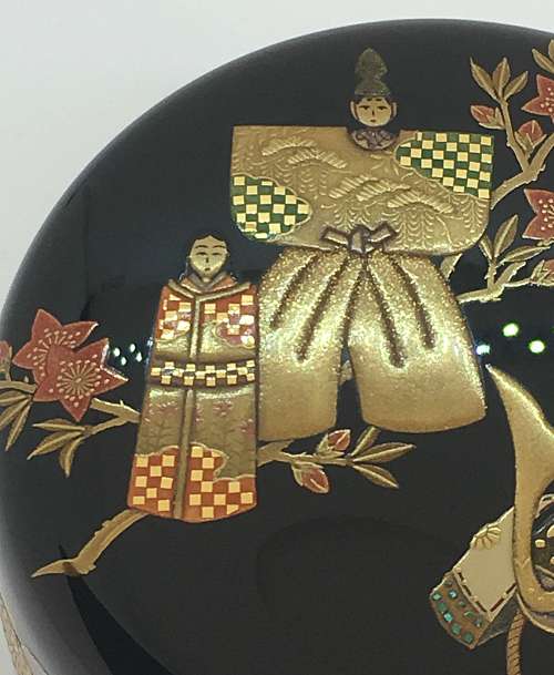 Item description :Wajima-nuri Oh Natsume tea caddy with attractive Makie works of Gosseku (the five sesonal festival in Japan)