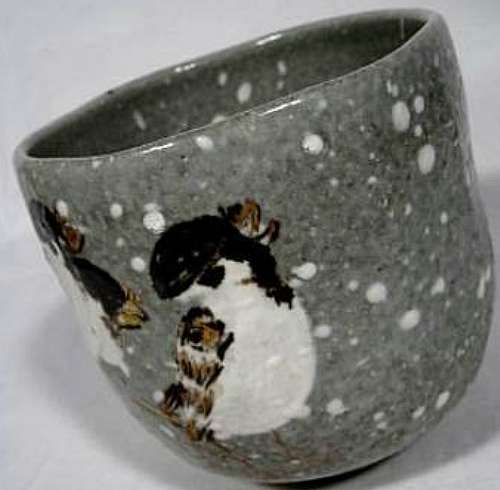 Item description : Kyoyaki Tsutsu Chawan tea bowl(tea bowl in cylinder shape) with a design of sparrows and snowfalls, titeld "Winter sparrow" used for winter