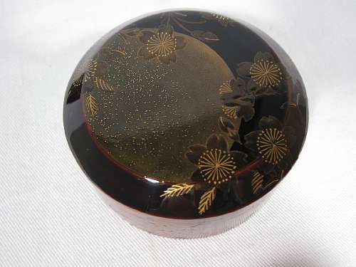 Item description : Tea caddy in Fubuki with elegant Makie works of Sakura and the moon made of Ohka (Sakura birch)