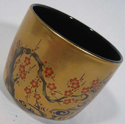 Item description : Kyoyaki tea bowl with a vivid design of Korinbai (originally drawn by Korin Ogata who is a great artist in Edo period 1600's) in Tsutsu style used for winter