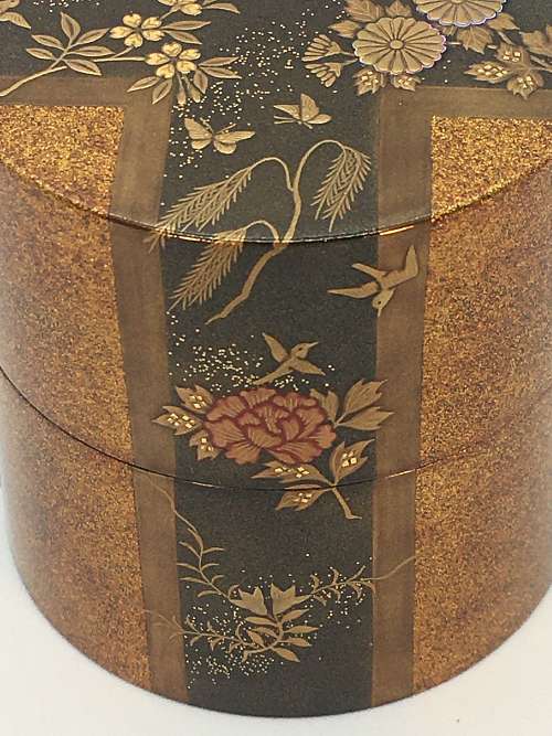 Item description : Wajima-nuri tea caddy in Nakatsugi style with stylish Makie works of Kacho (flowers and birds)