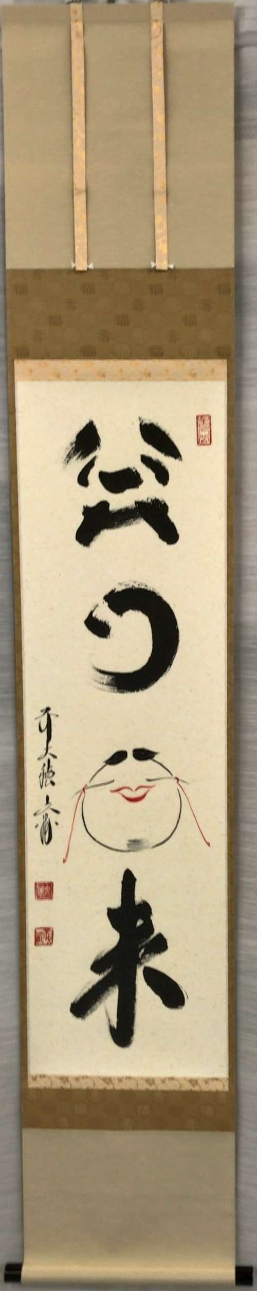 Item description : Chagake scroll with four letter idiom "Shomon Raifuku" (good fortune and happiness will come to the home of those who smile) drawn by Mr Bunga Noritani who is a chief priest at Hoshunji temple in Kyoto