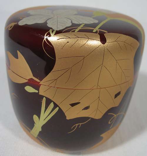 Item description : Chu Natsume tea caddy with elegant Makie works of Yugao (bottlegourd) with Tamenuri (brownish black) finish