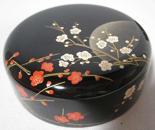 Item description : Oh Natsume tea caddy with attractive Makie works of Kohakubai (Ume in red and white)