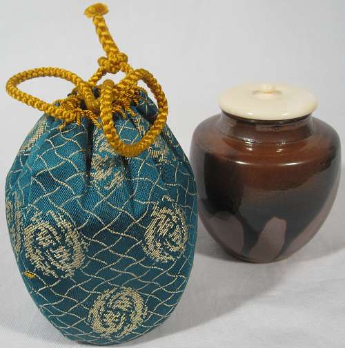 Item description : Utsushi (a replica) Meibutsu (traditionally famous) Chaire tea caddy called "Hatsu-bana" (first flower) named by the 8th general Yoshimasa Ashikaga (1449 - 1473). The original piece has been maintained in the Tokugawa museumn in Tokyo