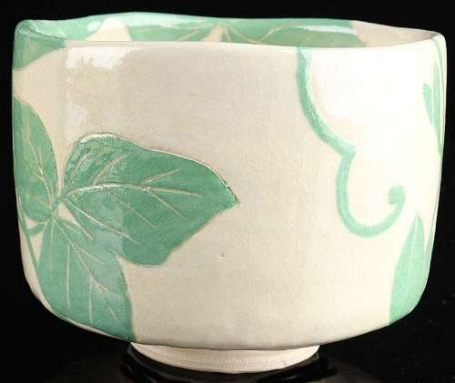 Itm description : Shiro (white)−raku tea bowl with design of Kuzu (arrowroot)