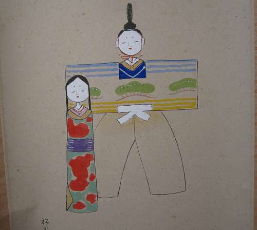 Item description : Chagake scroll with Hina-dolls and a Zengo "Toka Shunpu no Emu" (The peach blossom catches the spring breeze as well as last year and blooms beautifully and blooms beautifully/Even if our society changes, the flower blooms in the same way without changing) drawn by Mr Yodo Yukio who was a chief priest at Sokuoji temple in Hyogo prefecture)