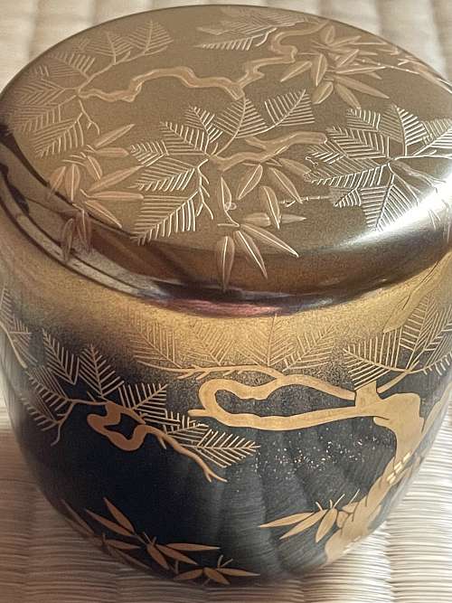 Item description : Wajima-nuri tea caddy with beautiful Makie works of Shochiku (Pine and bamboo)