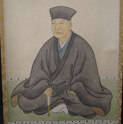 Item description :Chagake scroll with aportrait of Rikyu with his poem