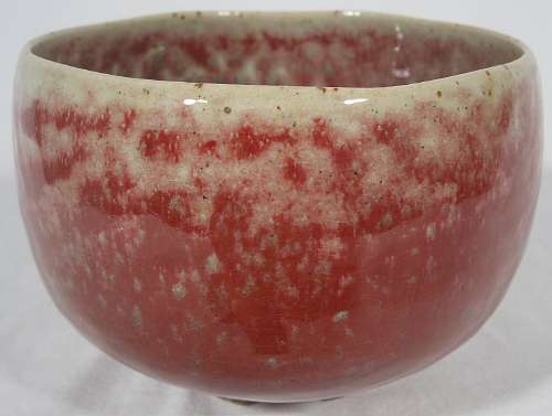 Item description : A local kiln Tsukiyano-yaki tea bowl with elegant Shinsha (cinnabar) glaze