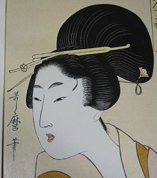 Item description : This is a replica of Bijinga (a beautiful woman) Ukiyoe woodblock print titled "Bijin Jyuniso(12 different faces of beuatiful women)" originally made by Kitagawa Utamaro (1753-1806). Please look at other replica woodblock prints made by Utamaro at utamaro.